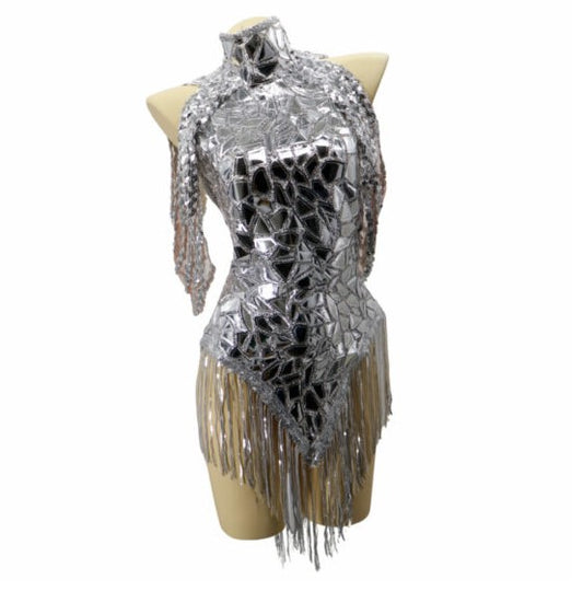Open Back High Neck Reflective Bodysuit with Fringe