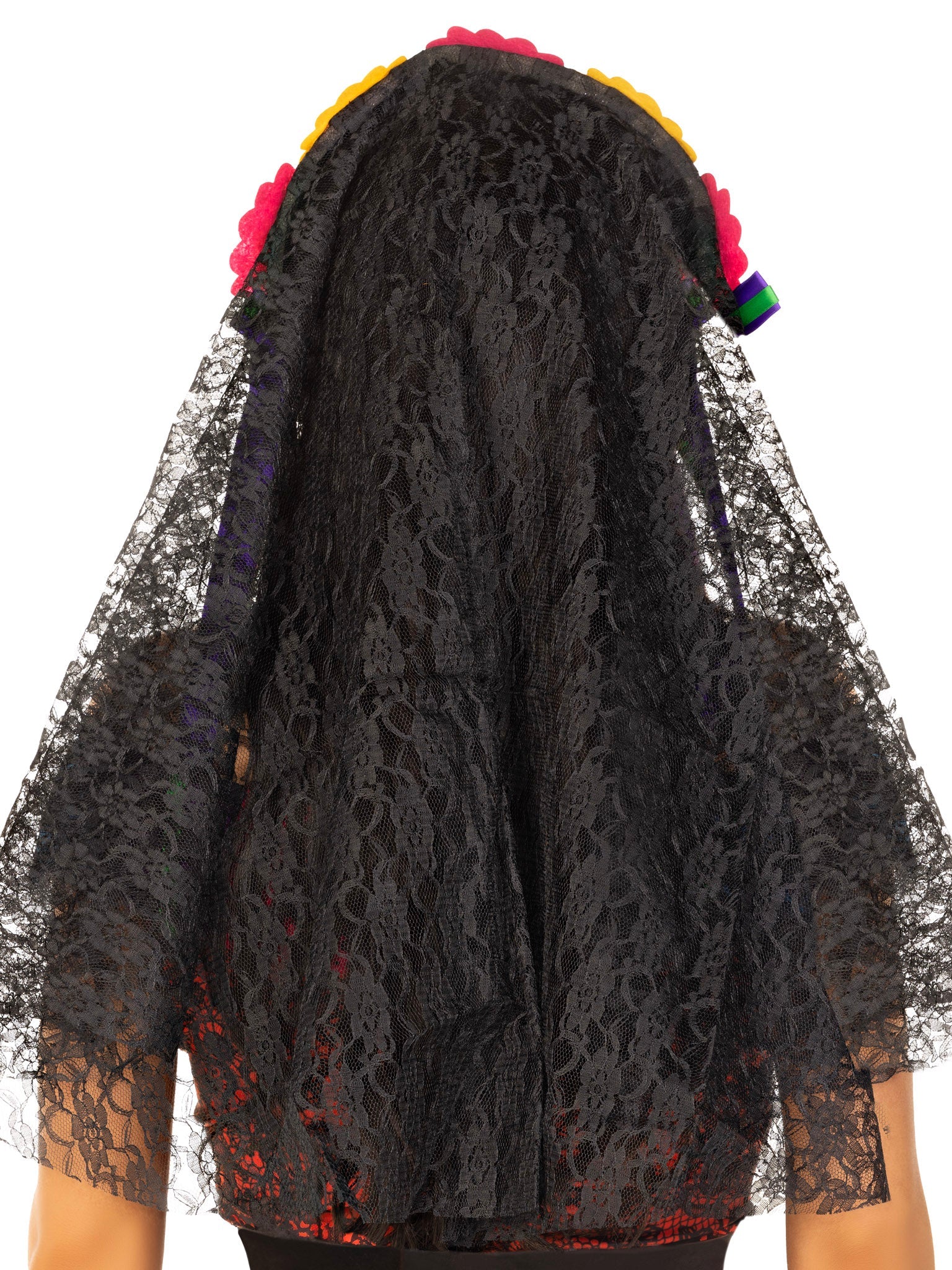 Layers of yellow, orange and pink felt create a vibrant display of colorful flowers to embody the bold colors of Mexico. A long flowing lace veil adds a luxurious touch to this sugar skull inspired look. The sweet, yet spooky design makes it easy to dress up almost any outfit for Halloween nights.